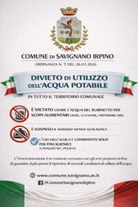 Si informa la cittadinanza di Savignano Irpino che, a seguito di controlli tecnici sulla rete idrica, è stata disposta l’immediata sospensione della potabilità dell’acqua su tutto il territorio comunale.